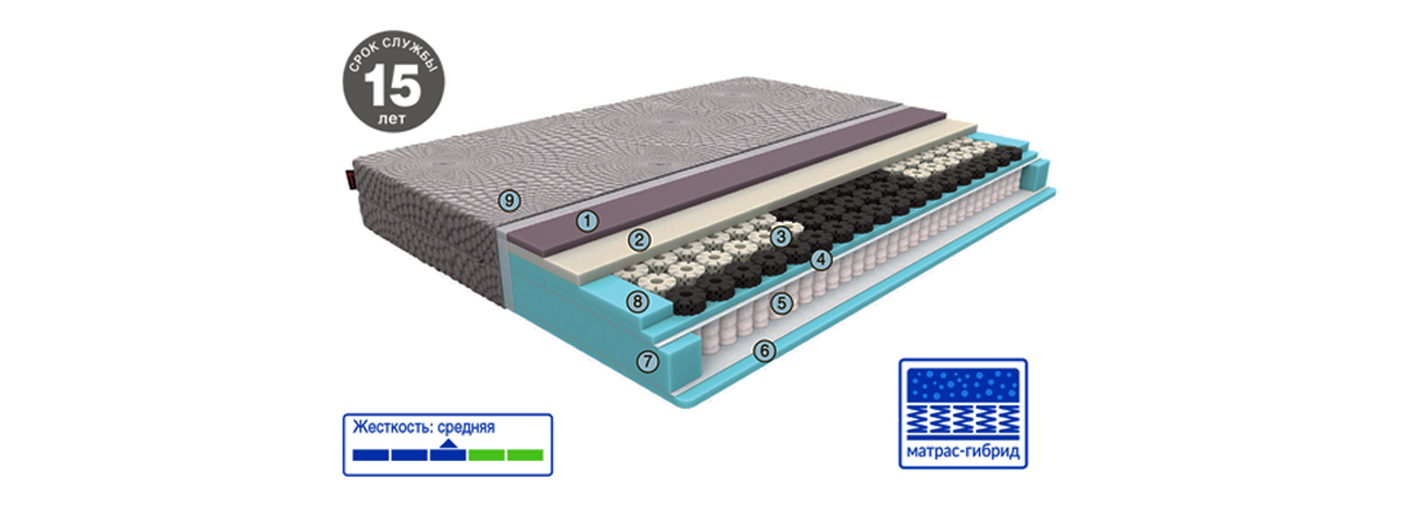 Матрас-гибрид, объединяющий в себе преимущества независимых пружин и пенных материалов. Уникальный комфортный слой матраса – целых 10 см сочетания пен с Octaspring ® . Такая комбинация материалов обеспечивает максимальное расслабление и качественный сон. В основе матраса независимый пружинный блок, обеспечивающий качественную и надежную поддержку позвоночника.